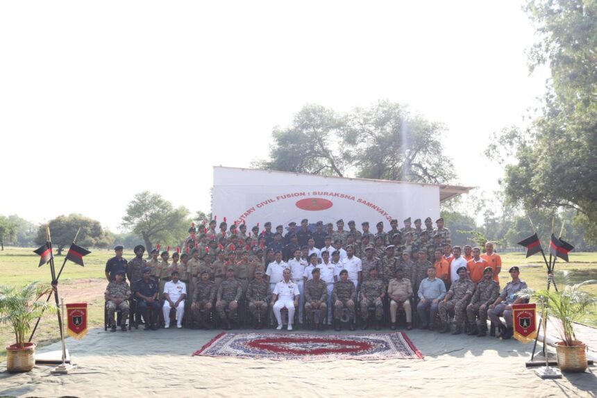 Ahmedabad : In a significant step towards strengthening Military-Civil Fusion (MCF), the Indian Army in collaboration with various civil organisations, paramilitary forces, security forces and academia, organised Exercise Suraksha Samnvay 2025 in Gandhinagar from 22 September to 27 September 2025. The events witnessed active participation from the Indian Army, Indian Coast Guard, Indian Railways, CRPF, BSF, CISF, NDRF, SDRF, Rashtriya Raksha University (RRU), National Forensic Science University (NFSU), Silver Oak University, Ahmedabad, Sardar Patel Institute of Public Administration & NCC, showcasing the collective strength of civil and military organisations working together for national preparedness.